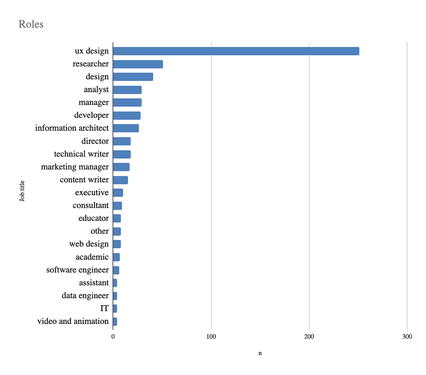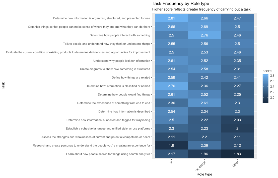 2. The term “UX Designer” still does not identify a specific role or skill set, more than ten years after the Memphis plenary* This also makes it difficult to define it, especially outside communities like the one behind WIAD. How can the industry understand which person it needs if multiple roles seem to include identical tasks? The most specific UX task was “Determine the experience of something from end to end” while the least specific task was “Determine how things are related” which showed almost no difference between job types.